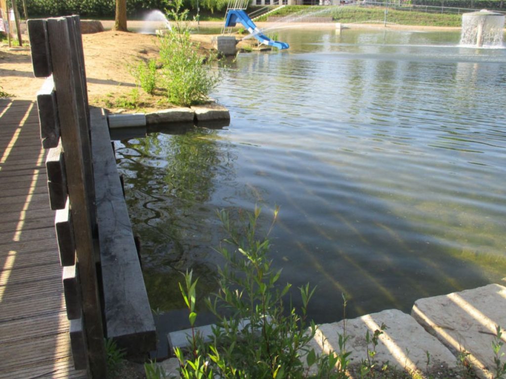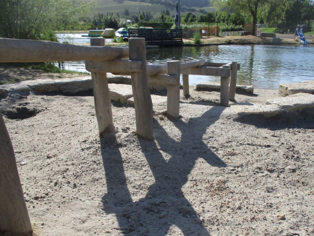 Au Sud du bassin enfants, des modules de jeux en bois intégrant eau est sable sont créés. Diverses installations tels qu’un ponton en bois et des jets d’eau en pierre animent également le bassin. Les berges quant à elles sont aménagées soit par des murs en pierre soit des zones de végétation.