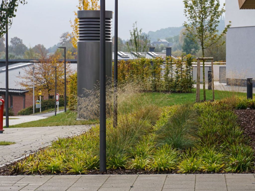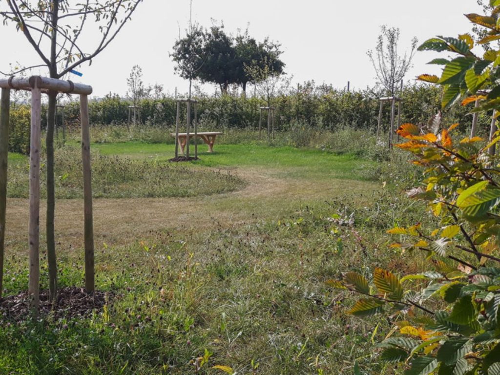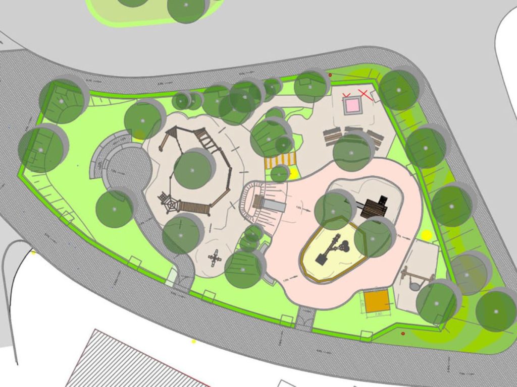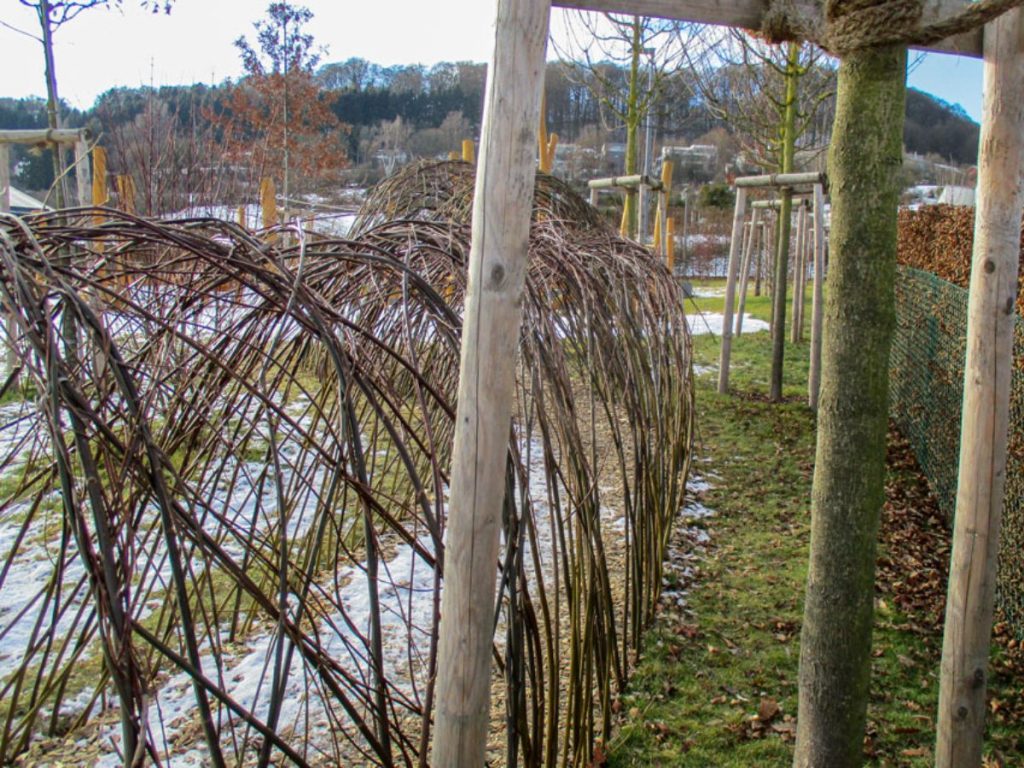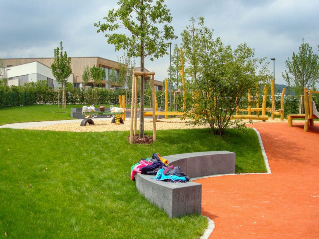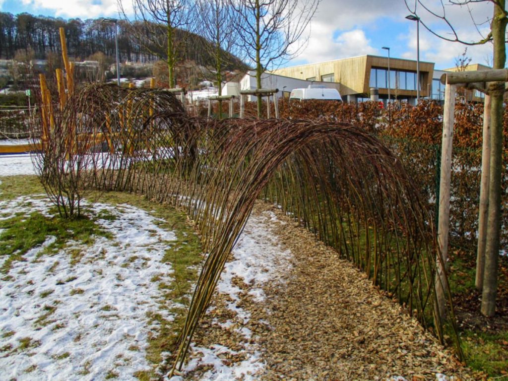 Cette aire de jeux joue avec la variation des matériaux, des expériences et des sensations pour les enfants. Elle se veut sécurisante et soignée pour les enfants en bas âge par des délimitations claires et des haies taillées. Véritable aménagement ludique elle offre un contact avec l’eau, le sable, le bois, les écorces, des tunnels de saules vivants et de multiples couleurs.