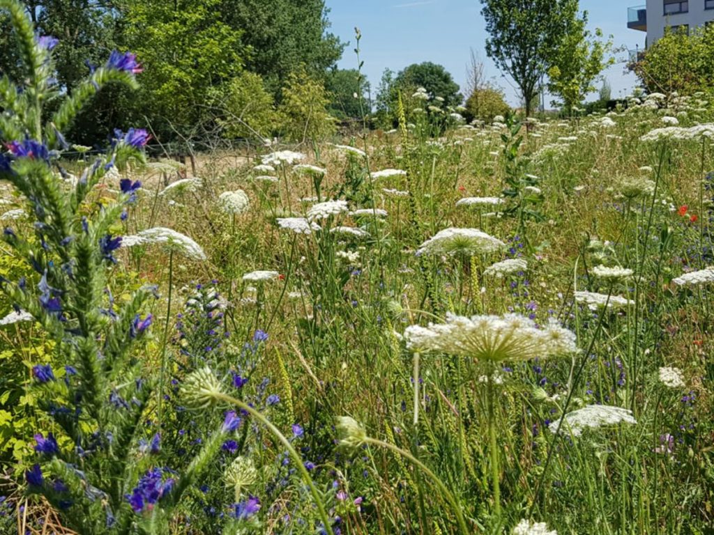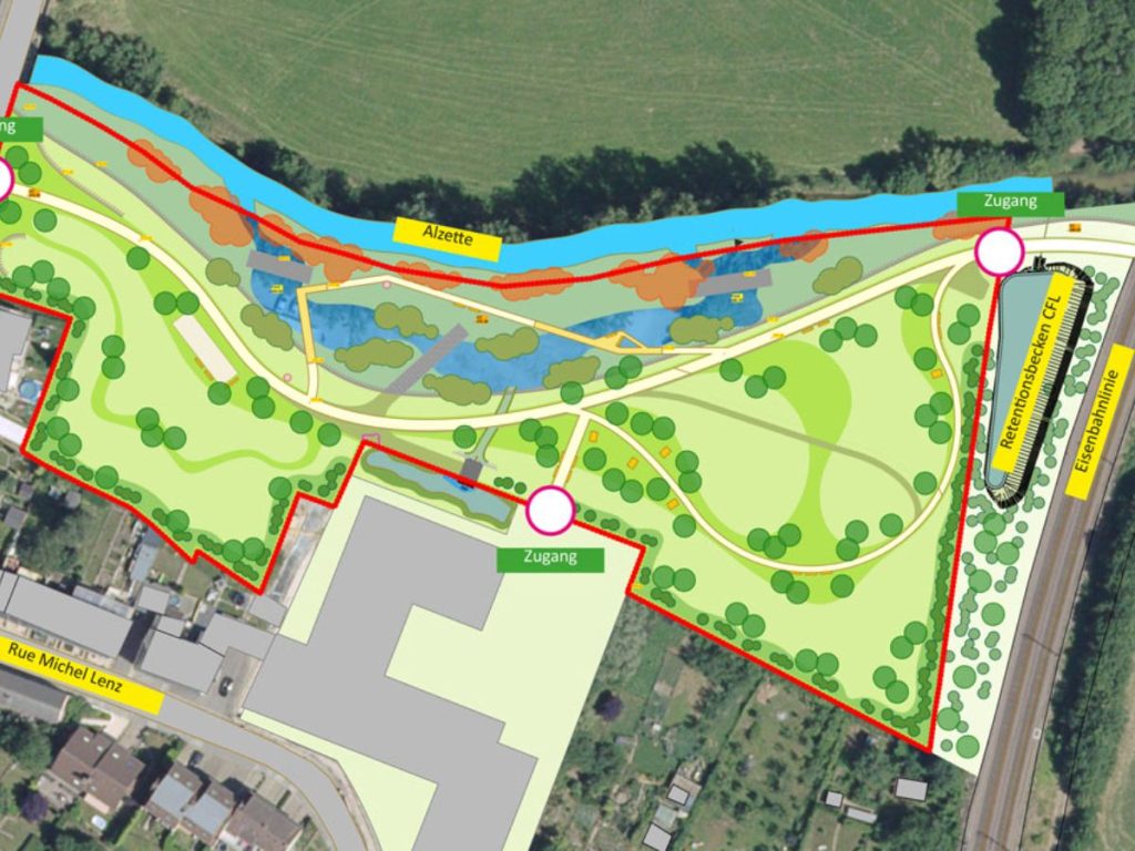 Un large chemin de 3,5m permet la traversée du parc par les piétons, cyclistes et véhicules d’entretien. Des accès secondaires plus étroits proposent des itinéraires variés. Tantôt à travers une zone humide via des pilotis en bois tantôt aux milieux de prairies et pelouses notamment par des chemins plus discrets en pelouse macadamisée. Un espace voué à la renaturation le long de l’Alzette est mis en place, il permet la colonisation spontanée d’espèces indigène et améliore considérablement la qualité environnementale du site. Ainsi le projet dessine des environnements de faibles utilisations laissés à la nature (massifs, bosquets, zones humides et prairies) et des zones plus intensives propices au divertissement et aux jeux (pelouse, chemins, bancs, terrain de pétanque)