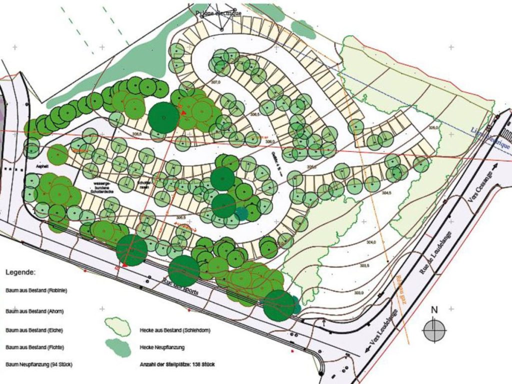Afin de répondre à un besoin de stationnement, la commune entreprend la création d’un parking. Ce dernier n’étant pas sollicité en continu et localisé au beau milieu d’un bosquet, une intégration maximale est souhaitée. A travers la thématique du parking écologique l’aménagement est constitué de revêtements perméables, de plantations en quantités importantes et conservera au maximum les arbres existants. Ainsi lorsque les voitures disparaissent une nouvelle ambiance apparait et le tissu vert environnant semble quasiment ininterrompu.