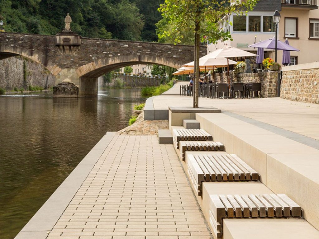 L’aménagement se veut moderne et épuré, les couleurs clairs beige et grise apportent de la douceur et invite à la détente. Des gradins placés au niveau de l’Our permettent un accès direct à l’eau, ils sont accompagnés de plantation qui offriront de l’ombrage lors des jours ensoleillés.
